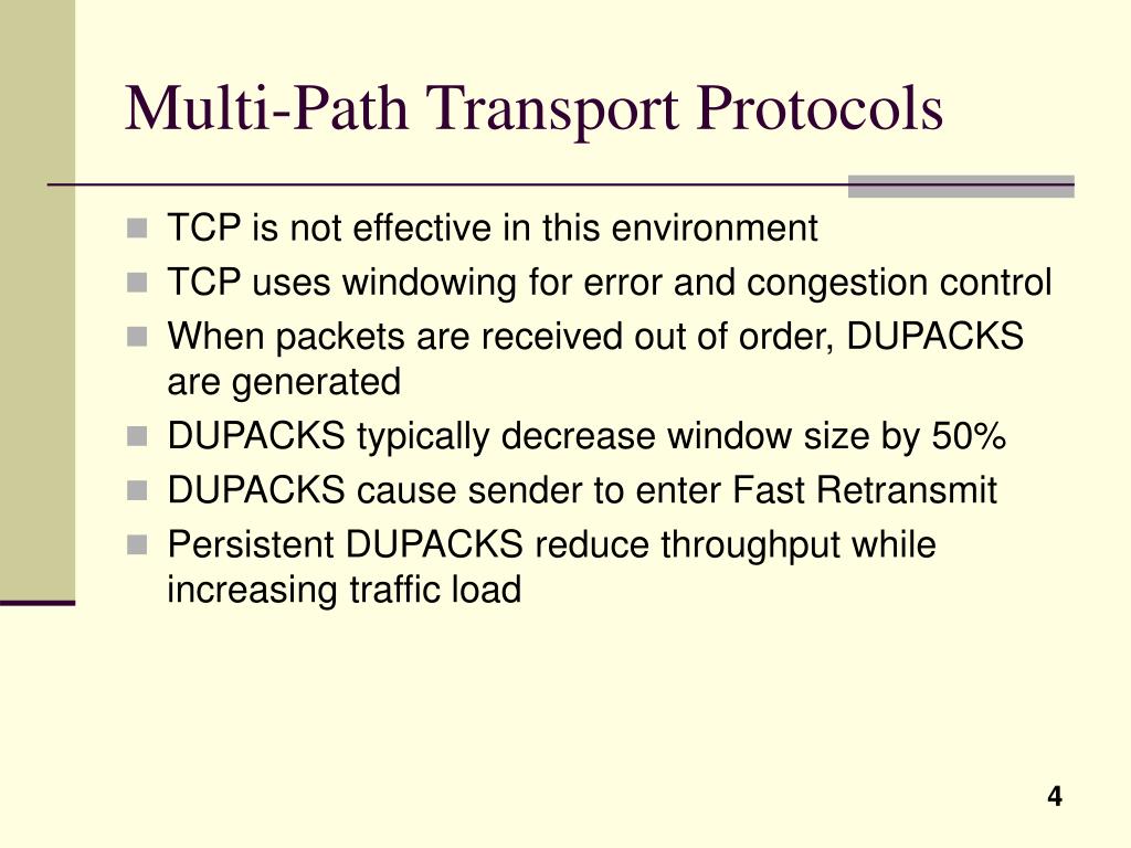 Multi-Path Transport Protocols • TCP is not effective in this environment • TCP uses windowing for error and congestion control • When packets are received out of order, DUPACKS are generated • DUPACKS typically decrease window size by 50% • DUPACKS cause sender to enter Fast Retransmit • Persistent DUPACKS reduce throughput while increasing traffic load
