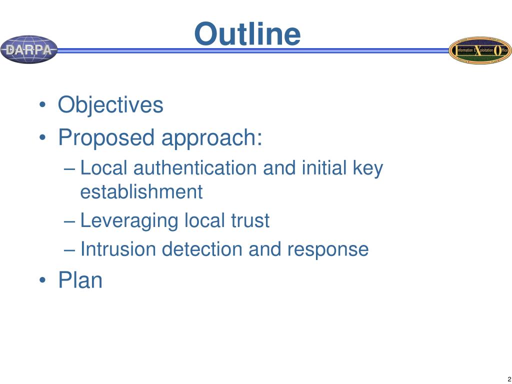 Outline • Objectives • Proposed approach: • Local authentication and initial key establishment • Leveraging local trust • Intrusion detection and response • Plan