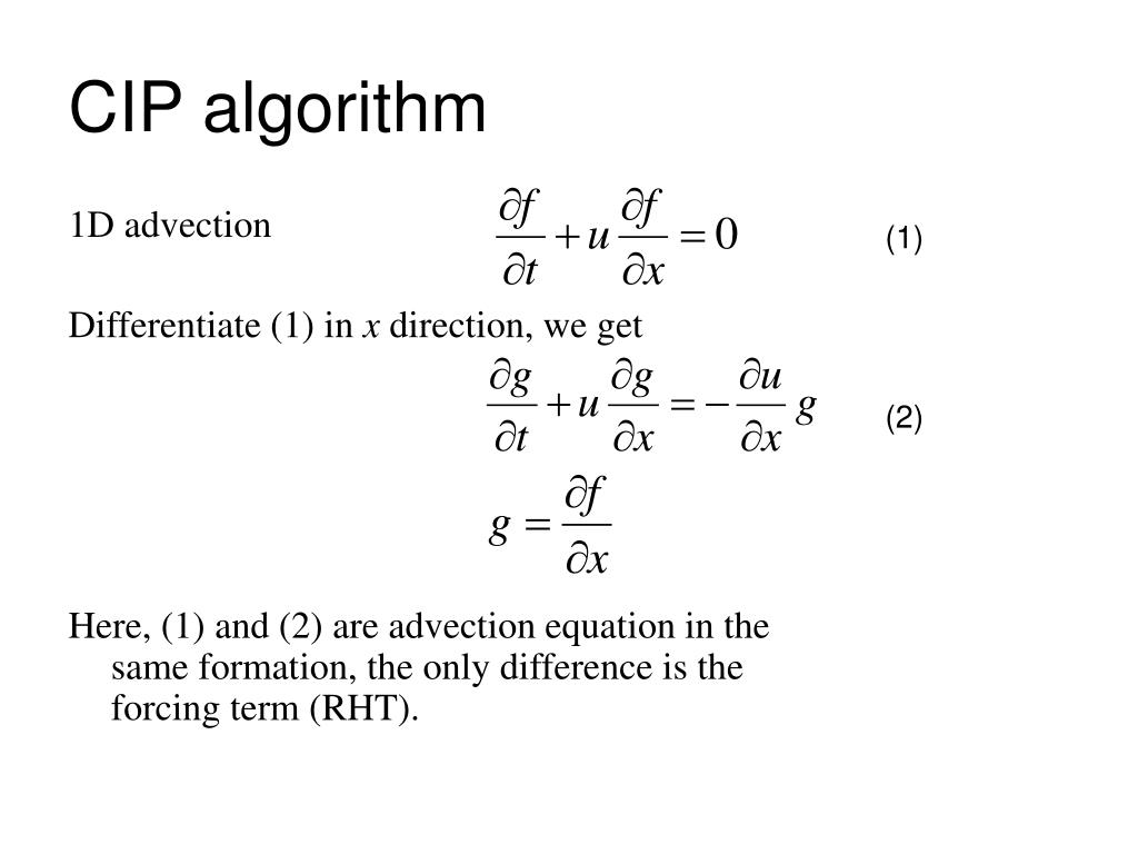 CIP algorithm 1D advection Differentiate (1) in x direction, we get Here, (1) and (2) are advection equation in the same formation, the only difference is the forcing term (RHT). (1) (2)