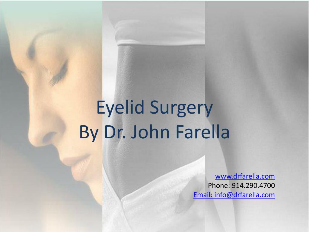 Eyelid Surgery By Dr. John Farella. As people age, the eyelid skin stretches, muscles weaken, and fat accumulates around the eyes, causing "bags" above and below. Step 1.