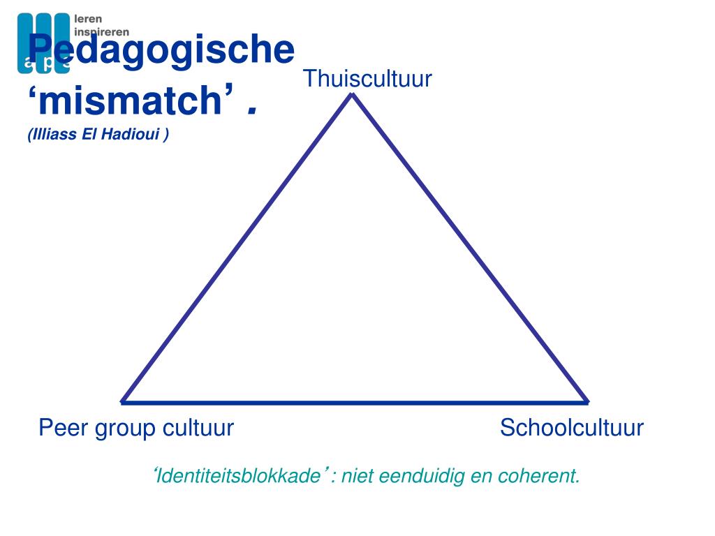 Pedagogische driehoek: ‘match’. (Illiass El Hadioui ) Thuiscultuur Peer group cultuur Schoolcultuur Identiteitsontwikkeling: eenduidig en coherent
