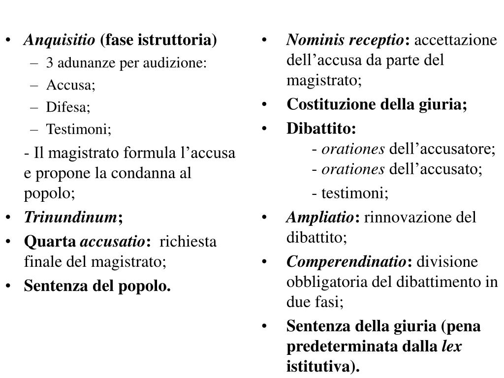 Anquisitio (fase istruttoria) 3 adunanze per audizione: Accusa; Difesa; Testimoni; - Il magistrato formula l’accusa e propone la condanna al popolo; Trinundinum; Quarta accusatio: richiesta finale del magistrato; Sentenza del popolo. Nominis receptio: accettazione dell’accusa da parte del magistrato; Costituzione della giuria; Dibattito: -orationes dell’accusatore; - orationes dell’accusato; - testimoni; Ampliatio: rinnovazione del dibattito; Comperendinatio: divisione obbligatoria del dibattimento in due fasi; Sentenza della giuria (pena predeterminata dalla lex istitutiva).