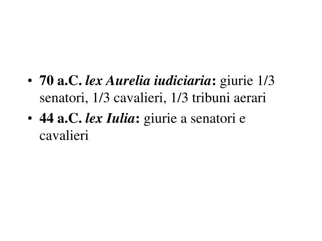 70 a.C. lex Aurelia iudiciaria: giurie 1/3 senatori, 1/3 cavalieri, 1/3 tribuni aerari • 44 a.C. lex Iulia: giurie a senatori e cavalieri