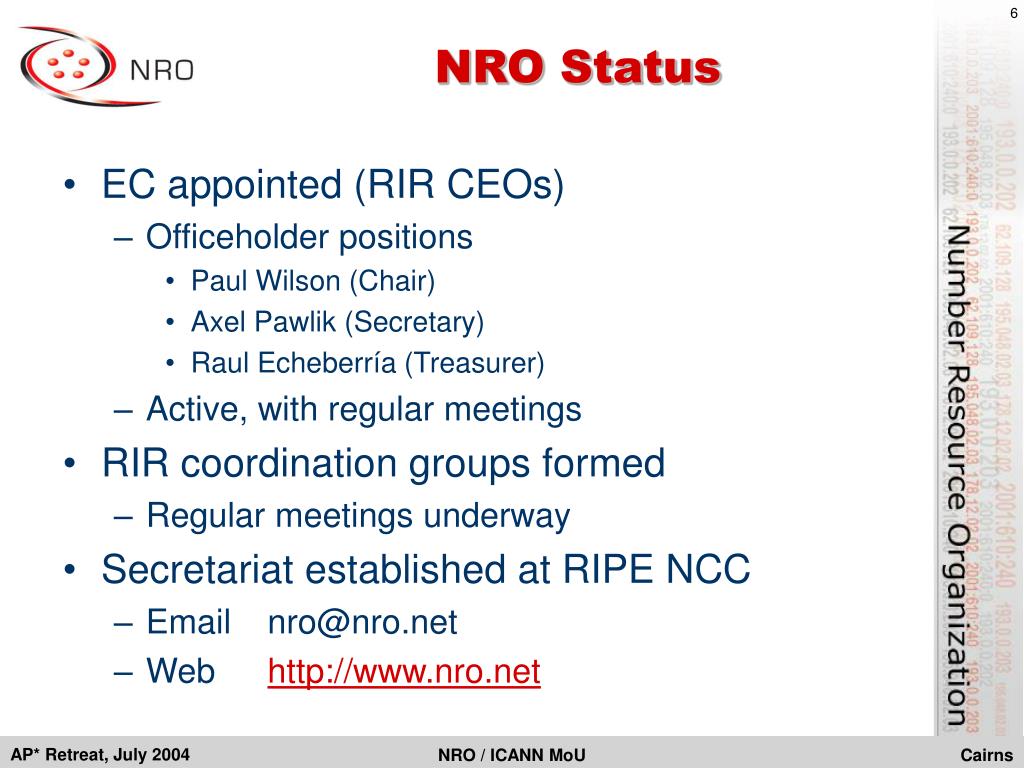 NRO/ICANN Status • “Letter of Intent” signed with ICANN • States intention to sign ASO MoU • Subject to ICANN/RIR comment period • Draft ASO MoU released and amended • After comment period • ICANN yet to decide its position • Release by RIRs of funds to ICANN • Total of 50% of fees “owing” • Balance to be paid on future milestones NRO / ICANN MoU