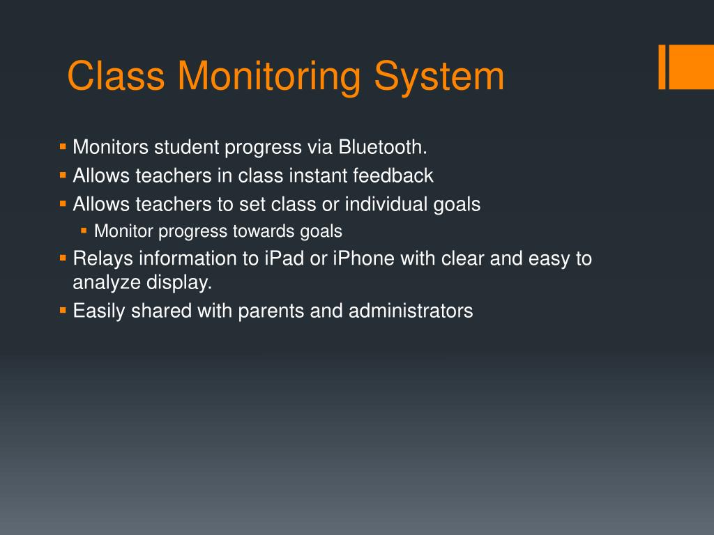Class Monitoring System • Monitors student progress via Bluetooth. • Allows teachers in class instant feedback • Allows teachers to set class or individual goals • Monitor progress towards goals • Relays information to iPad or iPhone with clear and easy to analyze display. • Easily shared with parents and administrators