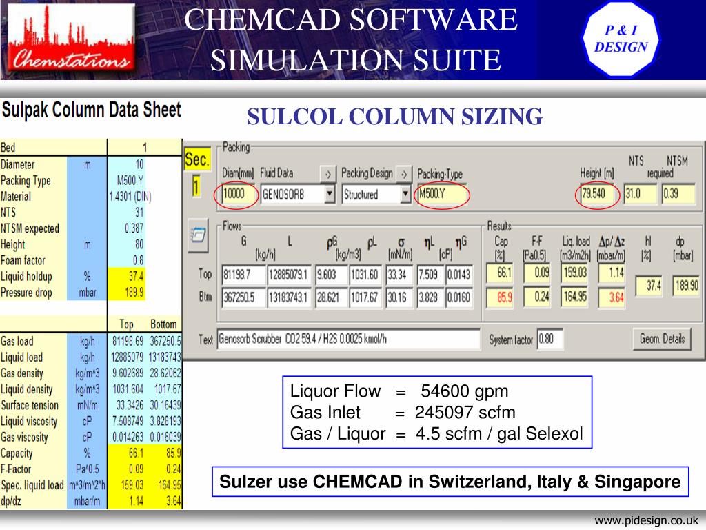 SULCOL COLUMN SIZING Liquor Flow = 54600 gpm Gas Inlet = 245097 scfm Gas / Liquor = 4.5 scfm / gal Selexol Sulzer use CHEMCAD in Switzerland, Italy & Singapore