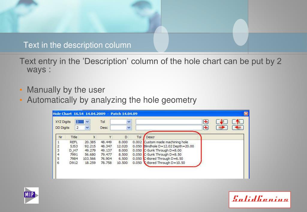 Text in the description column Text entry in the ’Description’ column of the hole chart can be put by 2 ways : • Manually by the user • Automatically by analyzing the hole geometry