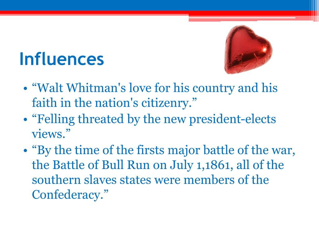 Influences • “Walt Whitman's love for his country and his faith in the nation's citizenry.” • “Felling threated by the new president-elects views.” • “By the time of the firsts major battle of the war, the Battle of Bull Run on July 1,1861, all of the southern slaves states were members of the Confederacy.”