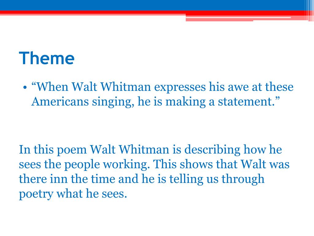 Theme • “When Walt Whitman expresses his awe at these Americans singing, he is making a statement.” In this poem Walt Whitman is describing how he sees the people working. This shows that Walt was there inn the time and he is telling us through poetry what he sees.