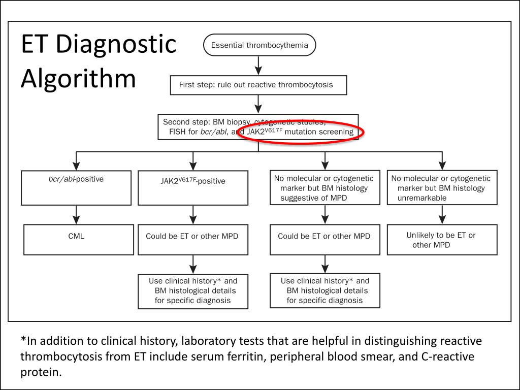 ET DiagnosticAlgorithm *In addition to clinical history, laboratory tests that are helpful in distinguishing reactive thrombocytosis from ET include serum ferritin, peripheral blood smear, and C-reactive protein.