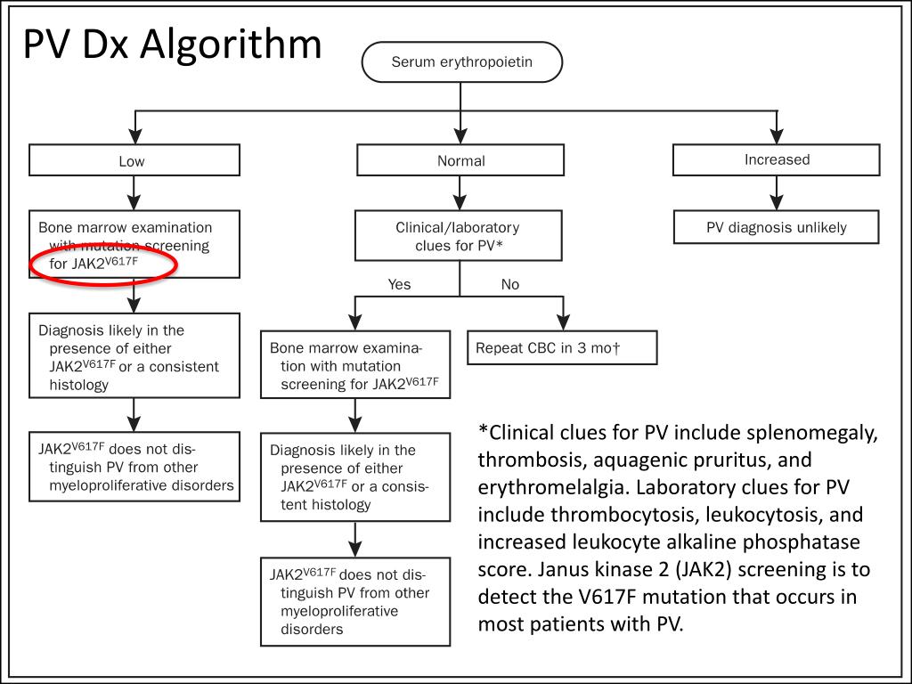 PV Dx Algorithm *Clinical clues for PV include splenomegaly, thrombosis, aquagenic pruritus, and erythromelalgia. Laboratory clues for PV include thrombocytosis, leukocytosis, and increased leukocyte alkaline phosphatase score. Janus kinase 2 (JAK2) screening is to detect the V617F mutation that occurs in most patients with PV.