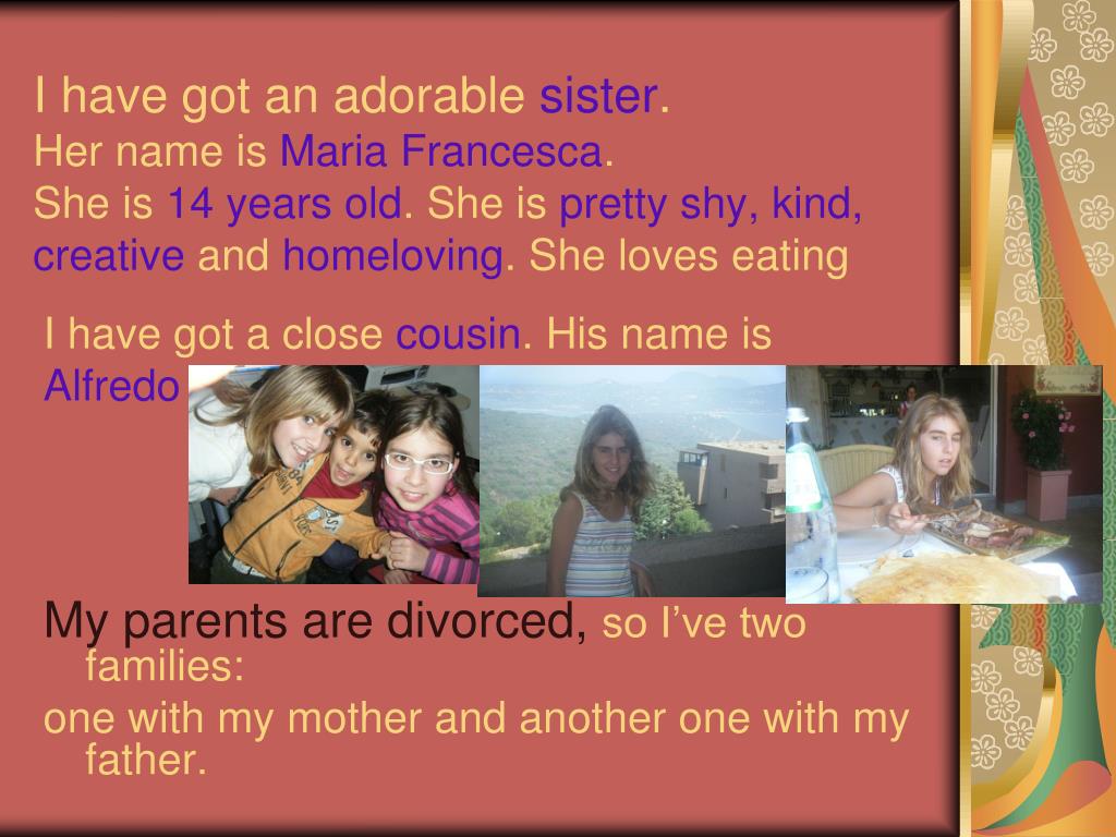 I have got an adorable sister.Her name is Maria Francesca.She is 14 years old. She is pretty shy, kind, creative and homeloving. She loves eating I have got a close cousin. His name is Alfredo My parents are divorced, so I’ve two families: one with my mother and another one with my father.