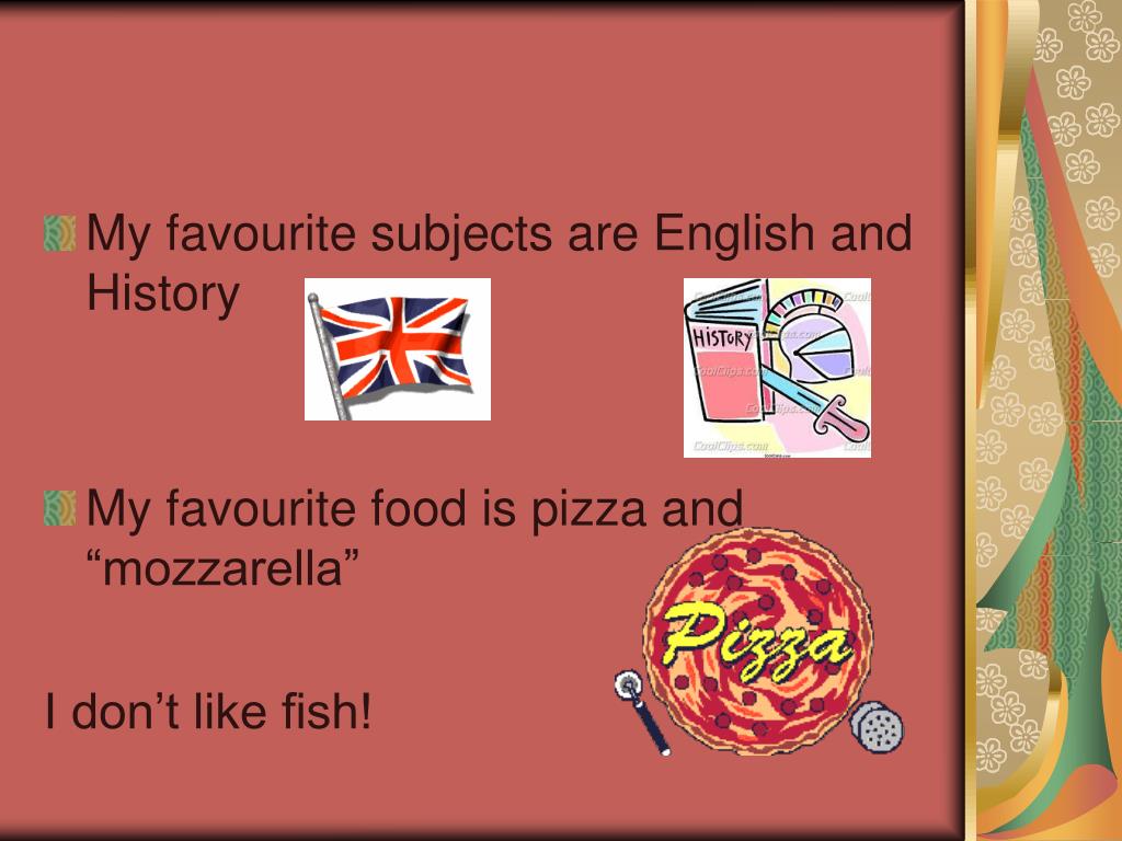 My favourite subjects are English and History • My favourite food is pizza and “mozzarella” I don’t like fish!