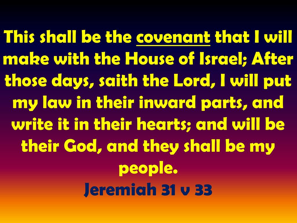 This shall be the covenant that I will make with the House of Israel; After those days, saith the Lord, I will put my law in their inward parts, and write it in their hearts; and will be their God, and they shall be my people. Jeremiah 31 v 33