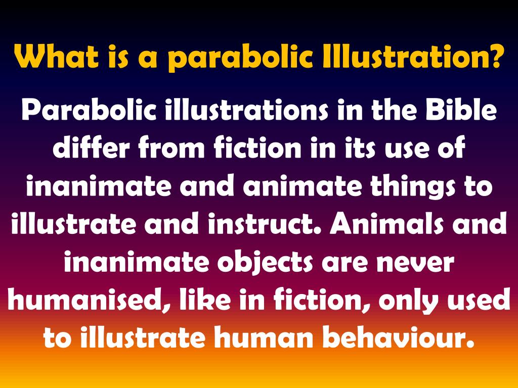 What is a parabolic Illustration? Parabolic illustrations in the Bible differ from fiction in its use of inanimate and animate things to illustrate and instruct. Animals and inanimate objects are never humanised, like in fiction, only used to illustrate human behaviour.