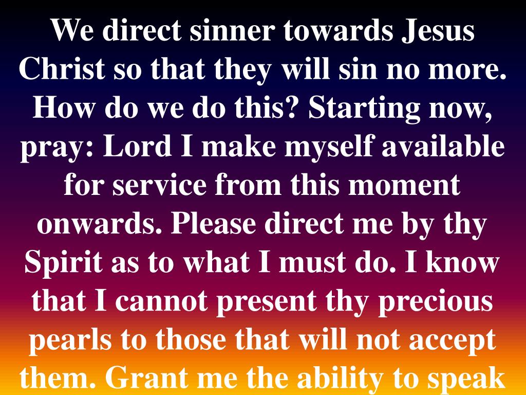 We direct sinner towards Jesus Christ so that they will sin no more. How do we do this? Starting now, pray: Lord I make myself available for service from this moment onwards. Please direct me by thy Spirit as to what I must do. I know that I cannot present thy precious pearls to those that will not accept them. Grant me the ability to speak when the Father draws them.