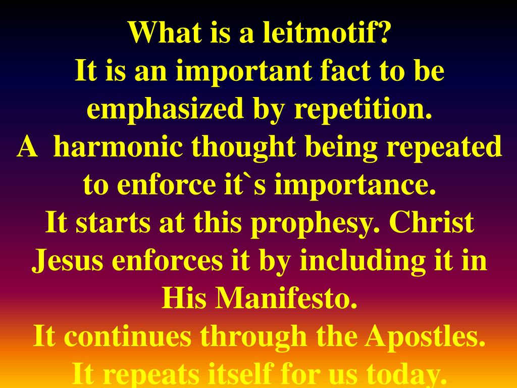 What is a leitmotif? It is an important fact to be emphasized by repetition. A harmonic thought being repeated to enforce it`s importance. It starts at this prophesy. Christ Jesus enforces it by including it in His Manifesto. It continues through the Apostles. It repeats itself for us today.