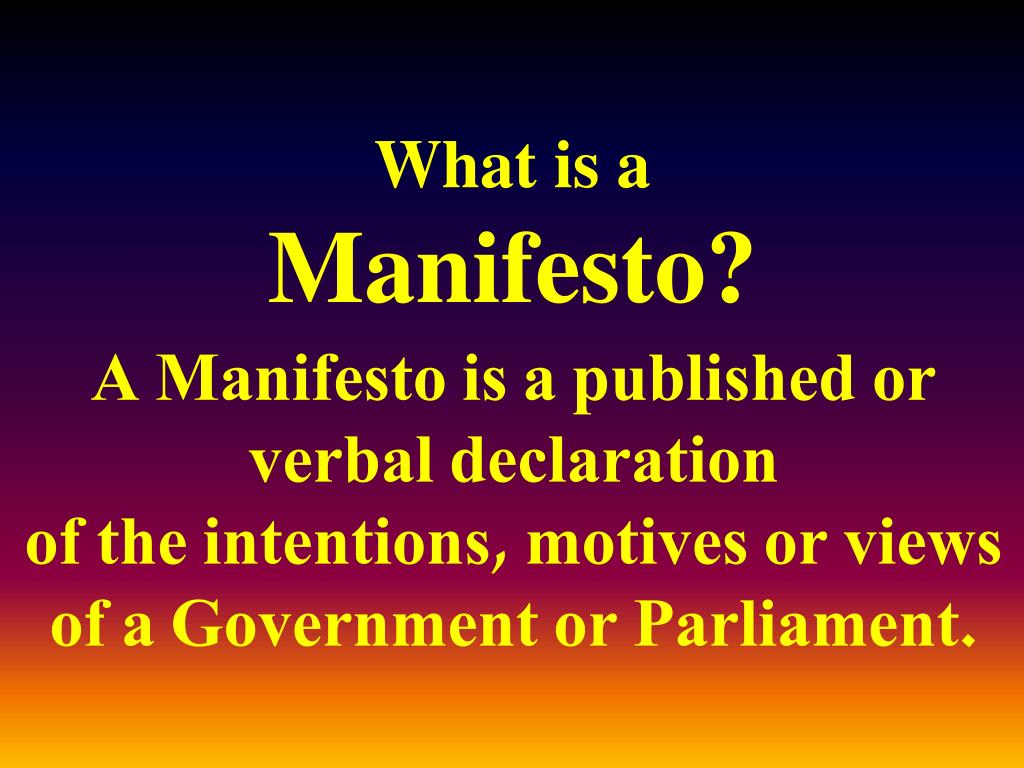 What is a Manifesto? A Manifesto is a published or verbal declaration of the intentions, motives or views of a Government or Parliament.
