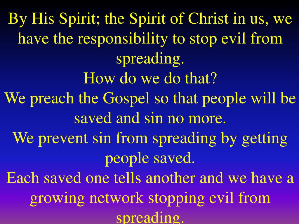 By His Spirit; the Spirit of Christ in us, we have the responsibility to stop evil from spreading. How do we do that? We preach the Gospel so that people will be saved and sin no more. We prevent sin from spreading by getting people saved. Each saved one tells another and we have a growing network stopping evil from spreading.