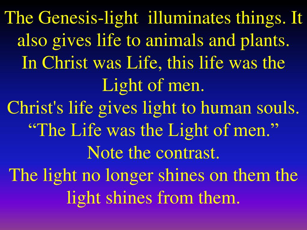 The Genesis-light illuminates things. It also gives life to animals and plants. In Christ was Life, this life was the Light of men. Christ's life gives light to human souls. “The Life was the Light of men.” Note the contrast. The light no longer shines on them the light shines from them.