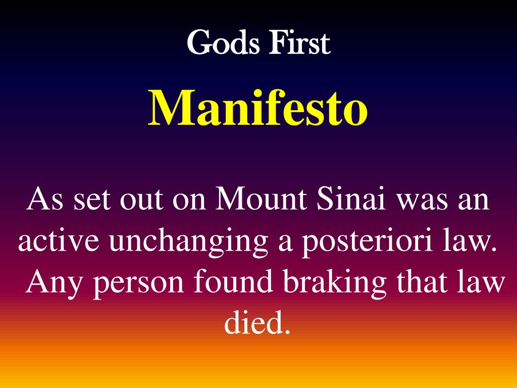 Gods First Manifesto As set out on Mount Sinai was an active unchanging a posteriori law. Any person found braking that law died.