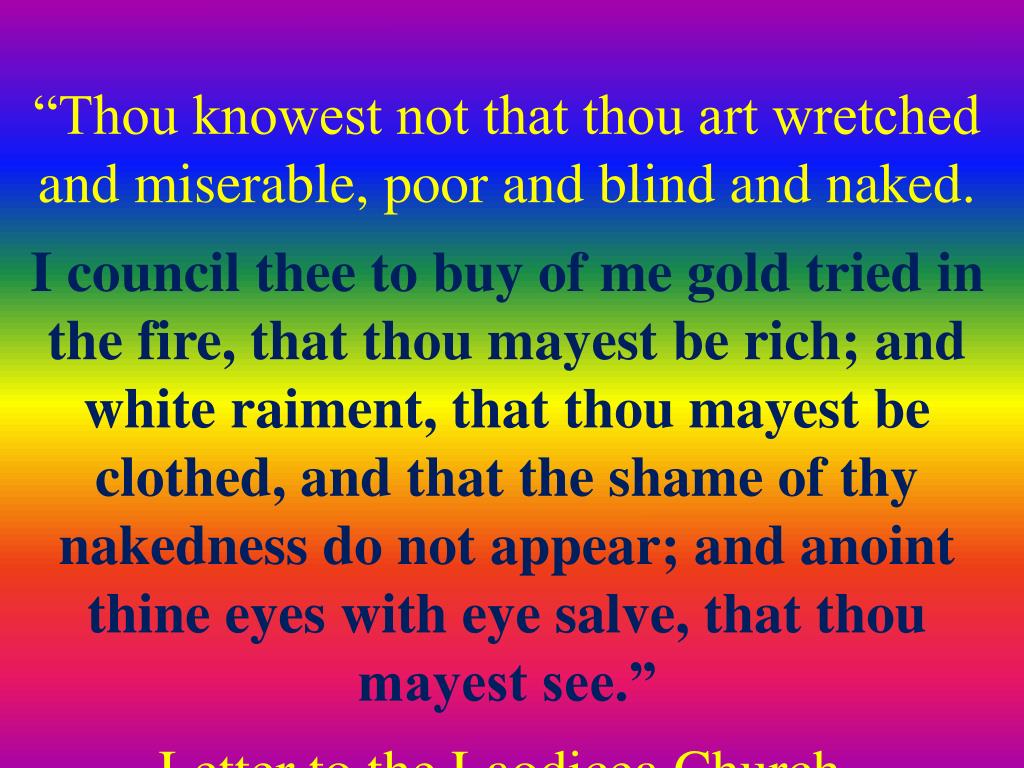 “Thou knowest not that thou art wretched and miserable, poor and blind and naked. I council thee to buy of me gold tried in the fire, that thou mayest be rich; and white raiment, that thou mayest be clothed, and that the shame of thy nakedness do not appear; and anoint thine eyes with eye salve, that thou mayest see.” Letter to the Laodicea Church.