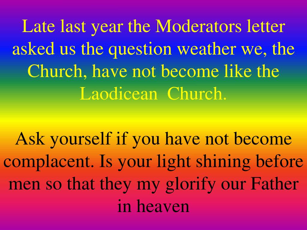 Late last year the Moderators letter asked us the question weather we, the Church, have not become like the Laodicean Church. Ask yourself if you have not become complacent. Is your light shining before men so that they my glorify our Father in heaven