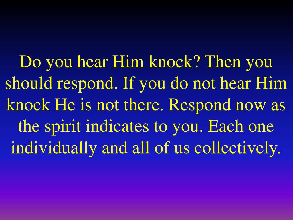 Do you hear Him knock? Then you should respond. If you do not hear Him knock He is not there. Respond now as the spirit indicates to you. Each one individually and all of us collectively.