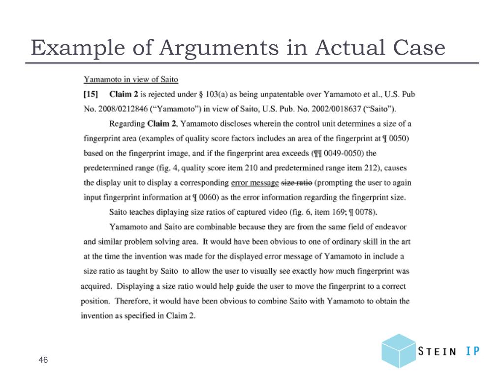 Example Case (Cont.) • Claim 2 is rejected under 35 U.S.C. § 103(a) as being unpatentable over Yamamoto et al., (U.S. Publication No. 2008/0212846) in view of Saito, U.S. Pub. No. 2002/0018637. • The examiner cites Saito for teaching displaying size ratios of captured video, and asserts that it would have been obvious to one of ordinary skill in the art at the time of the invention for the displayed error message of Yamamoto to include a size ratio as taught by Saito to all the user to visually see exactly how much fingerprint was acquired. • The examiner goes on to say Yamamoto and Saito are combinable because they are from the same field of endeavor. The applicant strongly disagrees and fails to see how these two references are from the same field of endeavor. Yamamoto’s field of endeavor is tools and techniques for obtaining biologic information input which is to be accepted or rejected as being input from a user, thereby providing a method of biometric authentication. Saito’s field of endeavor is providing a capture section to acquire a video signal in accordance with capture timing and capture time of a selected procedure information and storing the video signal in a digest temporary section as a digest video signal. After the signal recording is ended, the digest video signal is recorded on a magnetic tape section. Saito has nothing to with biologics in any way or authentication in any way. The disclosure at paragraph 0078 relates to a percentage represented by the cursor position at a position of a capture timing indicator, and the capture time at that percentage is displayed at the position of the capture time indicator. There is no mention of any metrics related to a human or even an authentication of any kind. • On top of the foregoing, Yamamoto et al. makes no mention of indicating the error in the fingerprint acquisition, so there is no motivation in Yamamoto et al. to even display whatever results Saito determines on a display, let alone one which shows the size ratio of a fingerprint. • The examiner asserts that displaying a size ratio would help guide the user to move the fingerprint to a correct position. The applicant does not dispute that in the least. However, that is one of the nice advantages of the present invention. Just because something would be helpful, does not mean that it would have been obvious to combine Saito with Yamamoto to obtain the invention as specified in claim 2. Under that reasoning, almost nothing would be patentable, because the examiner could almost always find something which would improve something else, but if there is no teaching or motivation, beyond it simply being helpful, then it would not have been obvious to combine those references.