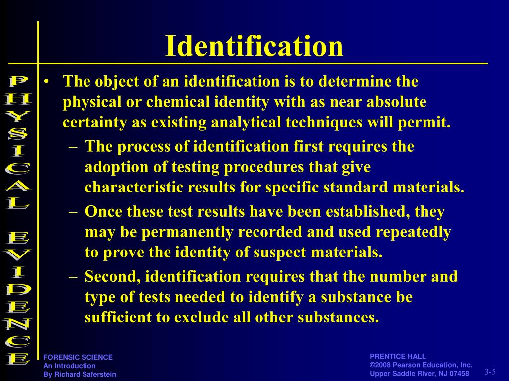 Identification • The object of an identification is to determine the physical or chemical identity with as near absolute certainty as existing analytical techniques will permit. • The process of identification first requires the adoption of testing procedures that give characteristic results for specific standard materials. • Once these test results have been established, they may be permanently recorded and used repeatedly to prove the identity of suspect materials. • Second, identification requires that the number and type of tests needed to identify a substance be sufficient to exclude all other substances. PHYSICAL EVIDENCE