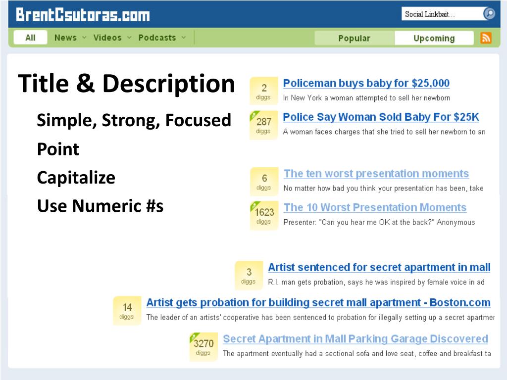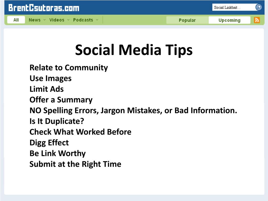 Social Media Tips Relate to Community Use Images Limit Ads Offer a Summary NO Spelling Errors, Jargon Mistakes, or Bad Information. Is It Duplicate? Check What Worked Before Digg Effect Be Link Worthy Submit at the Right Time