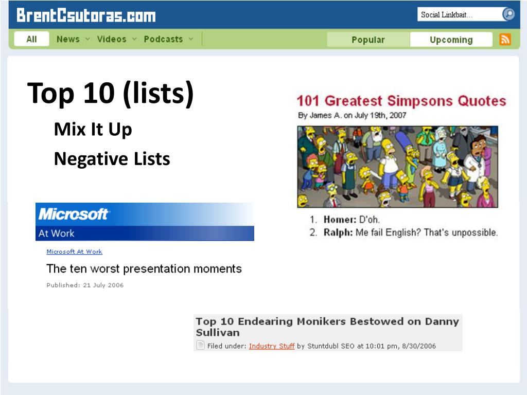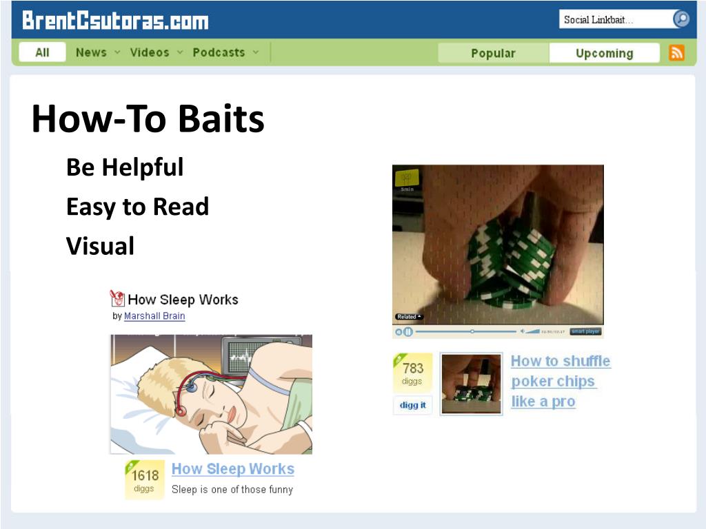 Social Media Linkbait. Social Media Linkbait Get Links Branding Reach. Social Media Linkbait Overview of Linkbait Categories Crafting a Linkbait. Top 10 (lists) Mix It Up Negative Lists. How-To Baits Be Helpful Easy to Read Visual. Current Events Act Fast Research Be Accurate.