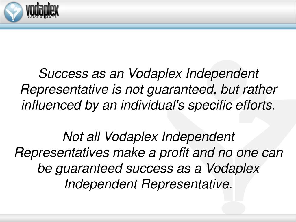 Success as an Vodaplex Independent Representative is not guaranteed, but rather influenced by an individual's specific efforts. Not all Vodaplex Independent Representatives make a profit and no one can be guaranteed success as a Vodaplex Independent Representative.