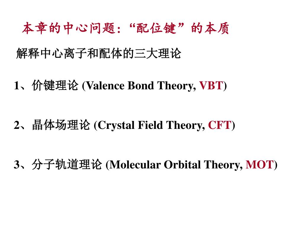 本章的中心问题: “配位键”的本质 解释中心离子和配体的三大理论 1、价键理论 (Valence Bond Theory,VBT) 2、晶体场理论 (Crystal Field Theory, CFT) 3、分子轨道理论 (Molecular Orbital Theory, MOT)
