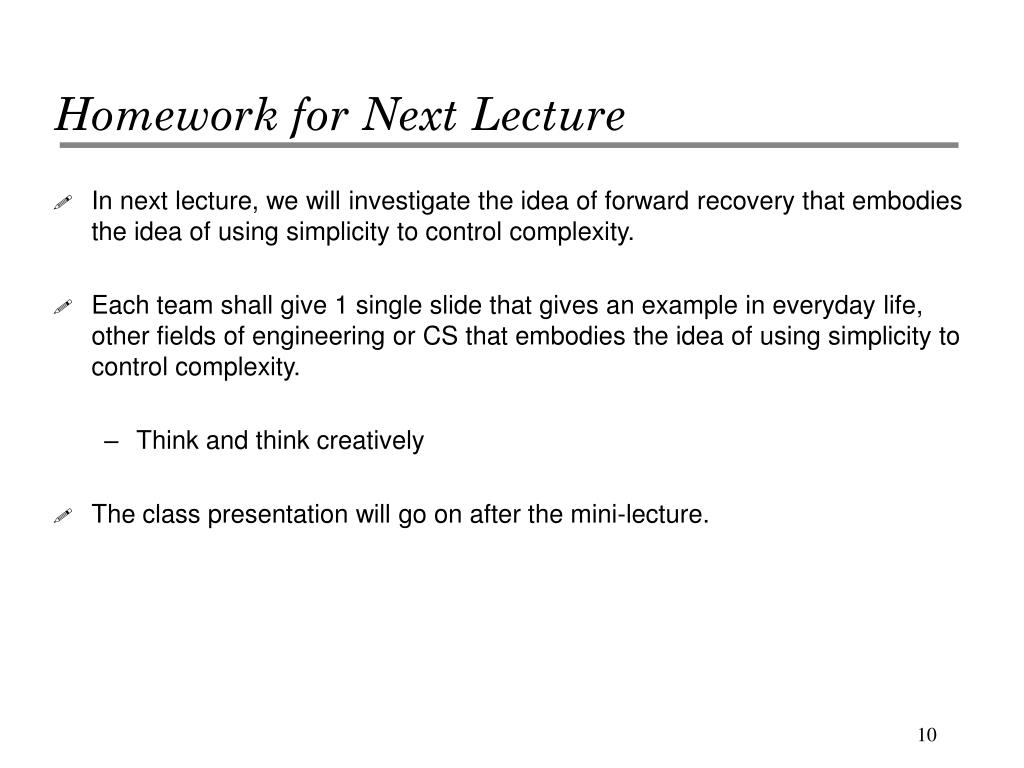 Homework for Next Lecture • In next lecture, we will investigate the idea of forward recovery that embodies the idea of using simplicity to control complexity. • Each team shall give 1 single slide that gives an example in everyday life, other fields of engineering or CS that embodies the idea of using simplicity to control complexity. • Think and think creatively • The class presentation will go on after the mini-lecture.