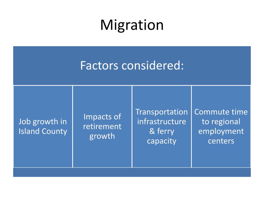 Commute Times Avg. Commute Times: US = 20 minutes WA = 26 minutes Ferry connection has finite vehicle capacity Transportation costs are increasing Trends suggest people are driving less and are not willing to endure extreme commutes Whidbey planning areas are isolated from regional job centers Only Camano Island is within standard commuting distance of major job centers *Snohomish & King County employment centers represent PSRC designated regional growth centers – Skagit County employment centers are the closest Skagit County UGAs to Island County Source: US Census – American Community Survey, Urban Geography: Pacione