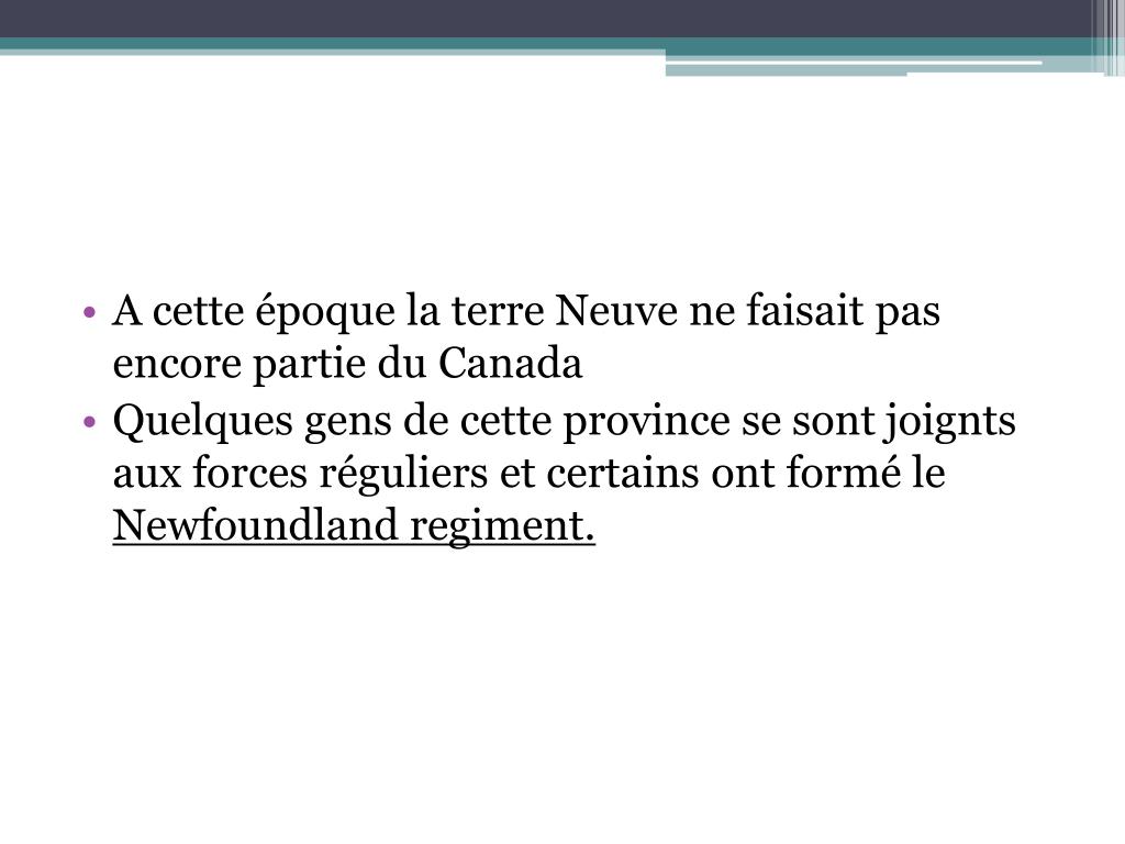 A cette époque la terre Neuve ne faisait pas encore partie du Canada • Quelques gens de cette province se sont joignts aux forces réguliers et certains ont formé le Newfoundland regiment.