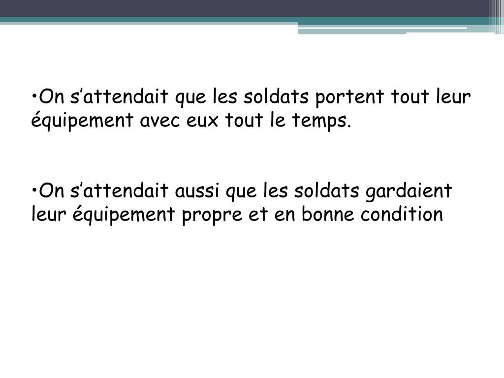 On s’attendait que les soldats portent tout leur équipement avec eux tout le temps. • On s’attendait aussi que les soldats gardaient leur équipement propre et en bonne condition