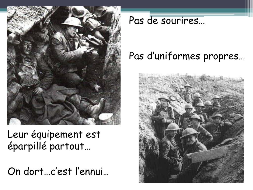 Pas de sourires… Pas d’uniformes propres… Leur équipement est éparpillé partout… On dort…c’est l’ennui…