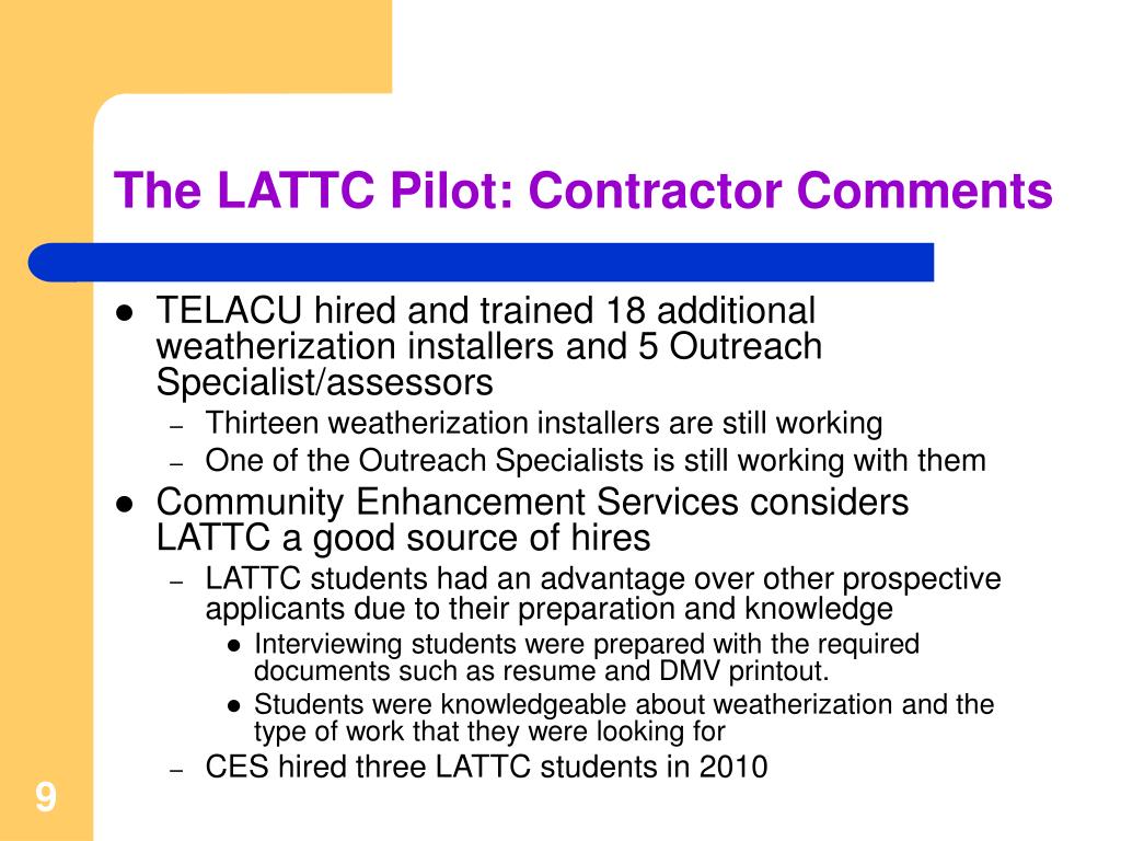 The LATTC Pilot: Contractor Comments • TELACU hired and trained 18 additional weatherization installers and 5 Outreach Specialist/assessors • Thirteen weatherization installers are still working • One of the Outreach Specialists is still working with them • Community Enhancement Services considers LATTC a good source of hires • LATTC students had an advantage over other prospective applicants due to their preparation and knowledge • Interviewing students were prepared with the required documents such as resume and DMV printout. • Students were knowledgeable about weatherization and the type of work that they were looking for • CES hired three LATTC students in 2010