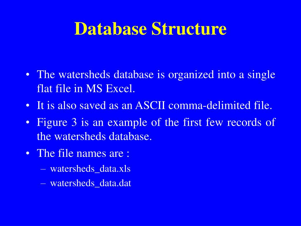 Database Structure • The watersheds database is organized into a single flat file in MS Excel. • It is also saved as an ASCII comma-delimited file. • Figure 3 is an example of the first few records of the watersheds database. • The file names are : • watersheds_data.xls • watersheds_data.dat