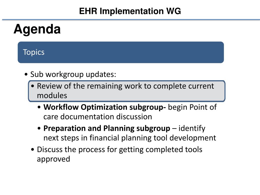 SCP EHR Implementation WG. EHR Implementation Workgroup. Meeting Date: 09/12/2011 Meeting Time: 3:30 pm – 5:00 pm Conference Line: (866) 740-1260 access code 7666801. Agenda. EHR Implementation WG. Agenda. EHR Implementation WG. EHR Implementation WG: Workflow Optimization Subgroup.