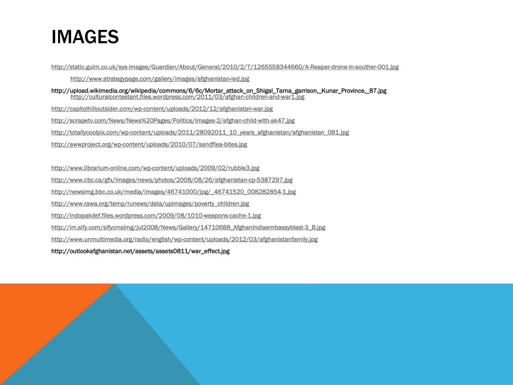 Images • http://static.guim.co.uk/sys-images/Guardian/About/General/2010/2/7/1265558344660/A-Reaper-drone-in-souther-001.jpg • http://www.strategypage.com/gallery/images/afghanistan-ied.jpg • http://upload.wikimedia.org/wikipedia/commons/6/6c/Mortar_attack_on_Shigal_Tarna_garrison,_Kunar_Province,_87.jpghttp://culturalcontestant.files.wordpress.com/2011/03/afghan-children-and-war1.jpg • http://capitolhilloutsider.com/wp-content/uploads/2012/12/afghanistan-war.jpg • http://scrapetv.com/News/News%20Pages/Politics/images-2/afghan-child-with-ak47.jpg • http://totallycoolpix.com/wp-content/uploads/2011/28092011_10_years_afghanistan/afghanistan_081.jpg • http://awwproject.org/wp-content/uploads/2010/07/sandflea-bites.jpg • http://www.librarium-online.com/wp-content/uploads/2009/02/rubble3.jpg • http://www.cbc.ca/gfx/images/news/photos/2008/08/26/afghanistan-cp-5387297.jpg • http://newsimg.bbc.co.uk/media/images/46741000/jpg/_46741520_008282854-1.jpg • http://www.rawa.org/temp/runews/data/upimages/poverty_children.jpg • http://indopakdef.files.wordpress.com/2009/08/1010-weapons-cache-1.jpg • http://im.sify.com/sifycmsimg/jul2008/News/Gallery/14710688_AfghanIndiaembassyblast-3_B.jpg • http://www.unmultimedia.org/radio/english/wp-content/uploads/2012/03/afghanistanfamily.jpg • http://outlookafghanistan.net/assets/assets0811/war_effect.jpg
