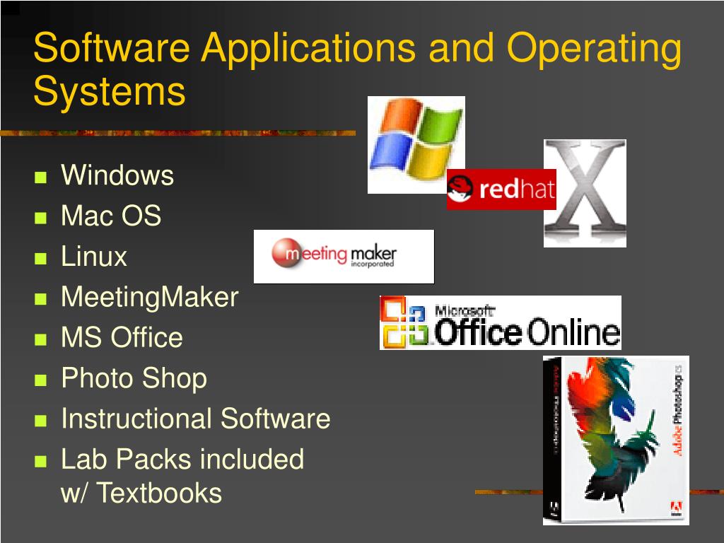Software Applications and Operating Systems • Windows • Mac OS • Linux • MeetingMaker • MS Office • Photo Shop • Instructional Software • Lab Packs included w/ Textbooks