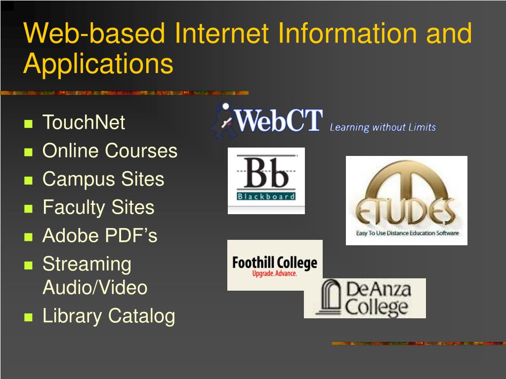 Web-based Internet Information and Applications • TouchNet • Online Courses • Campus Sites • Faculty Sites • Adobe PDF’s • Streaming Audio/Video • Library Catalog