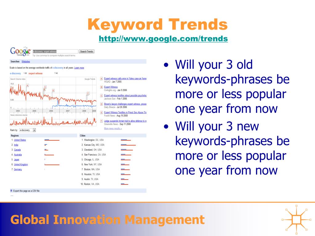 Keyword Trendshttp://www.google.com/trends • Will your 3 old keywords-phrases be more or less popular one year from now • Will your 3 new keywords-phrases be more or less popular one year from now