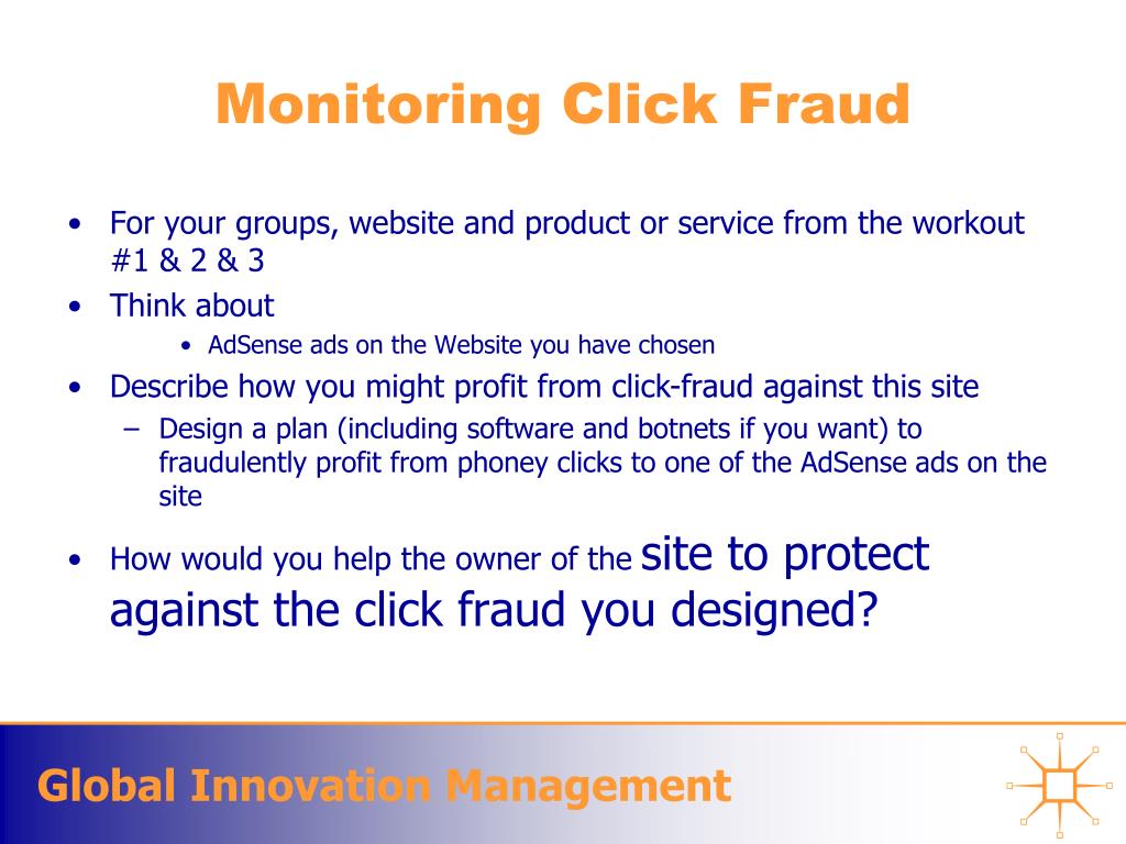 Monitoring Click Fraud • For your groups, website and product or service from the workout #1 & 2 & 3 • Think about • AdSense ads on the Website you have chosen • Describe how you might profit from click-fraud against this site • Design a plan (including software and botnets if you want) to fraudulently profit from phoney clicks to one of the AdSense ads on the site • How would you help the owner of the site to protect against the click fraud you designed?