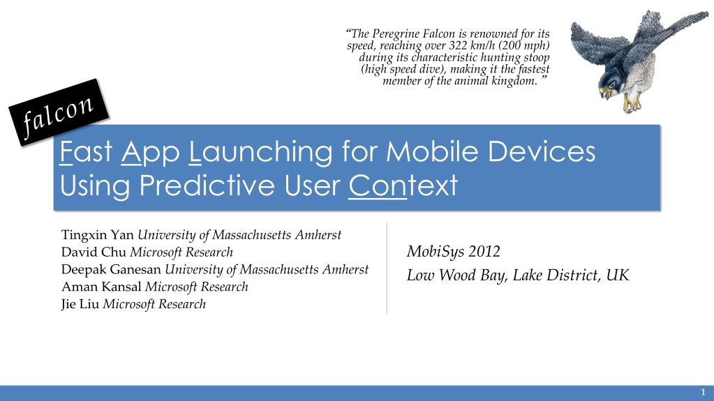 “The Peregrine Falcon is renowned for its speed, reaching over 322 km/h (200 mph) during its characteristic hunting stoop (high speed dive), making it the fastest member of the animal kingdom.” falcon Fast App Launching for Mobile Devices Using Predictive User Context Tingxin Yan University of Massachusetts Amherst David Chu Microsoft Research Deepak Ganesan University of Massachusetts Amherst Aman Kansal Microsoft Research Jie Liu Microsoft Research MobiSys 2012 Low Wood Bay, Lake District, UK