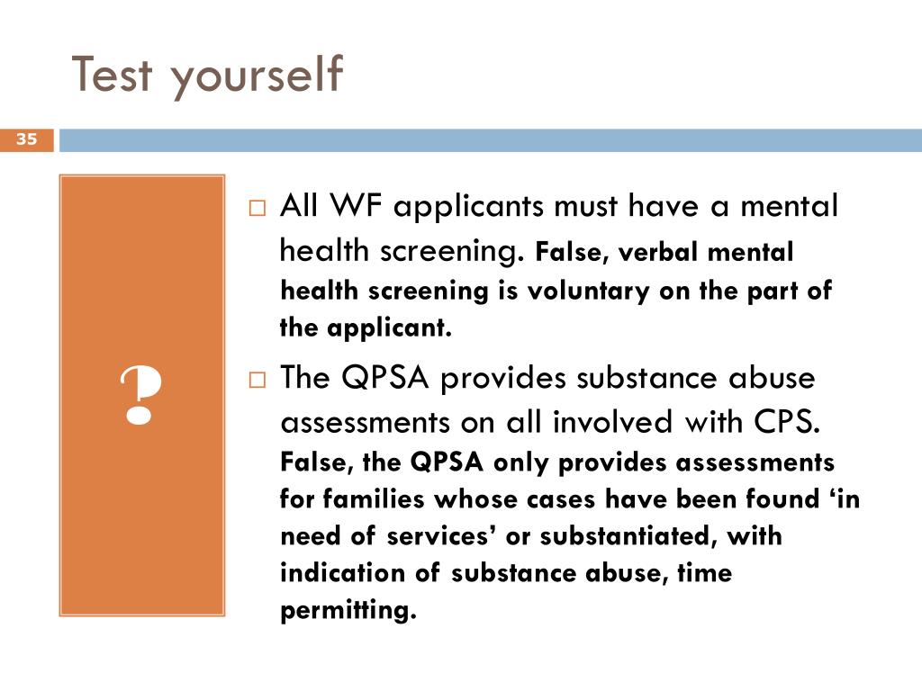 Test yourself ? • All WF applicants must have a mental health screening. False, verbal mental health screening is voluntary on the part of the applicant. • The QPSA provides substance abuse assessments on all involved with CPS. False, the QPSA only provides assessments for families whose cases have been found ‘in need of services’ or substantiated, with indication of substance abuse, time permitting.