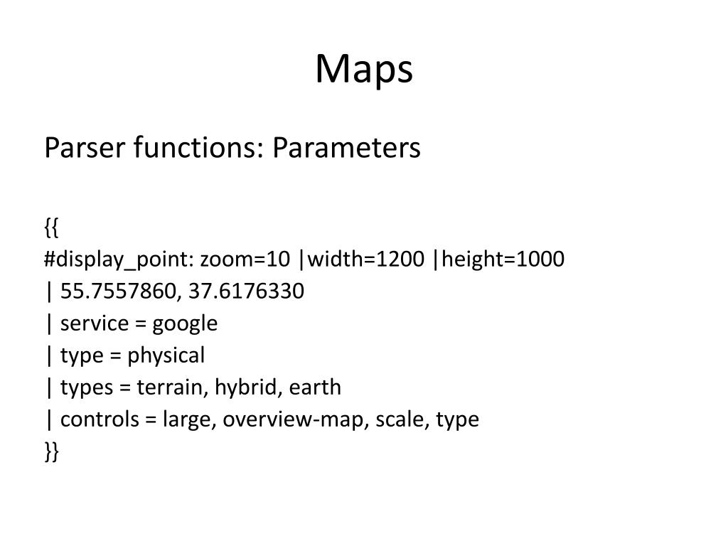 Maps Parser functions: Parameters {{ #display_point: zoom=10 |width=1200 |height=1000 | 55.7557860, 37.6176330 | service = google | type = physical | types = terrain, hybrid, earth | controls = large, overview-map, scale, type }} Not in the list?